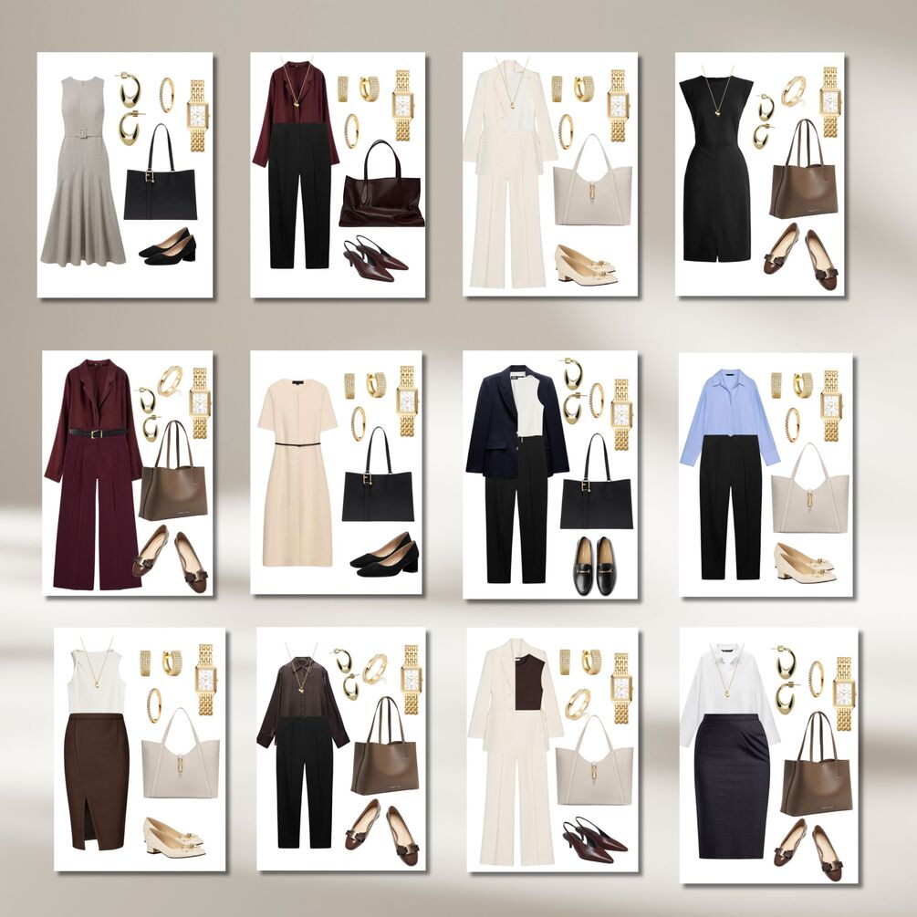 Simplify your mornings with this all-in-one digital capsule wardrobe system—designed for busy women who want to dress with elegance and ease. This business formal corporate Summer/Spring Capsule Wardrobe includes 68 pre-made classic outfits, plus style tools to declutter your closet, define your personal style, and dress confidently for your body shape.